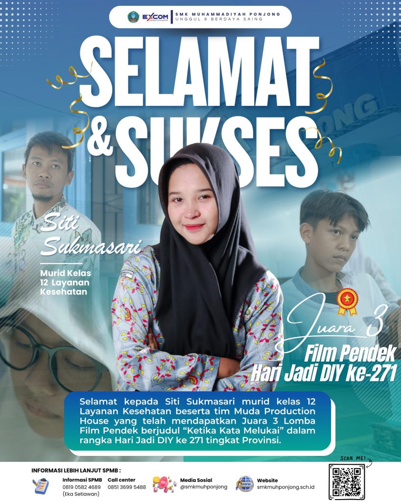 *🥳🎉🎊Selamat & Sukses! 🎊🎉🥳*Keluarga besar SMK Muhammadiyah Ponjong mengucapkan selamat dan apresiasi setinggi-tingginya kepada ananda *Siti Sukmasari*, murid kelas 12 Layanan Kesehatan, bersama tim Muda Production House yang telah meraih *Juara 3 Lomba Film Pendek dalam rangka Hari Jadi DIY ke-271 tingkat Provinsi*.Prestasi ini… Read more: Selamat dan Sukses atas Prestasi juara 3 lomba film pendek - Selamat dan Sukses Kepada Ibu Isnaini Rahmawati Kepala Sekolah SMK Muhammadiyah Ponjong